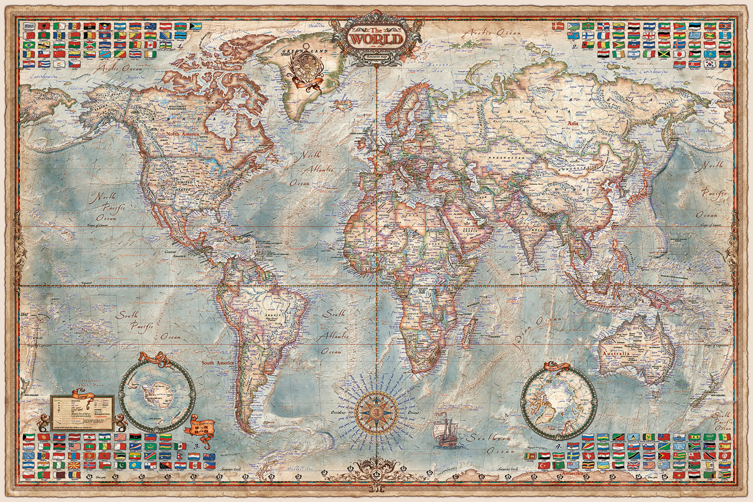 The design of the map is steeped in a vintage aesthetic, reminiscent of the grand age of exploration. The detailed rendering of mountain ranges and major cities brings the world's geography to life, while the compass rose and historical-style illustrations evoke a sense of adventure and discovery. The map's decorative elements, including old ships, add a touch of historical charm, making it a captivating piece for any collector or enthusiast.