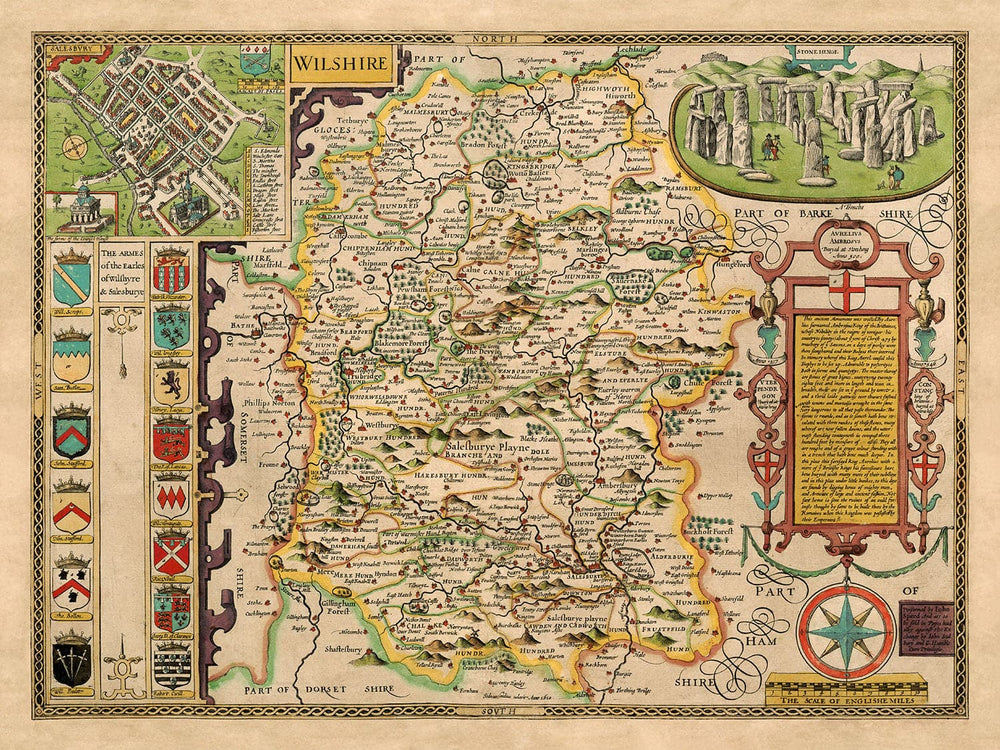 This old, full colour and exceedingly rare map shows the ancient county of Wiltshire as it was in 1611. It was created by John Speed and engraved by Jodocus Hondius, and originally published in Speed's "The Theatre of the Empire of Great Britaine".