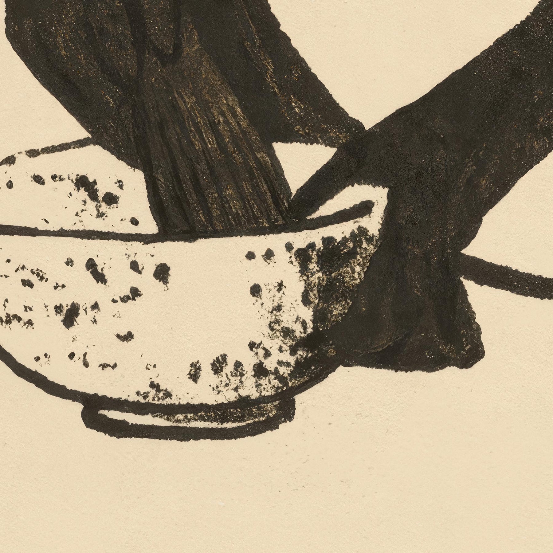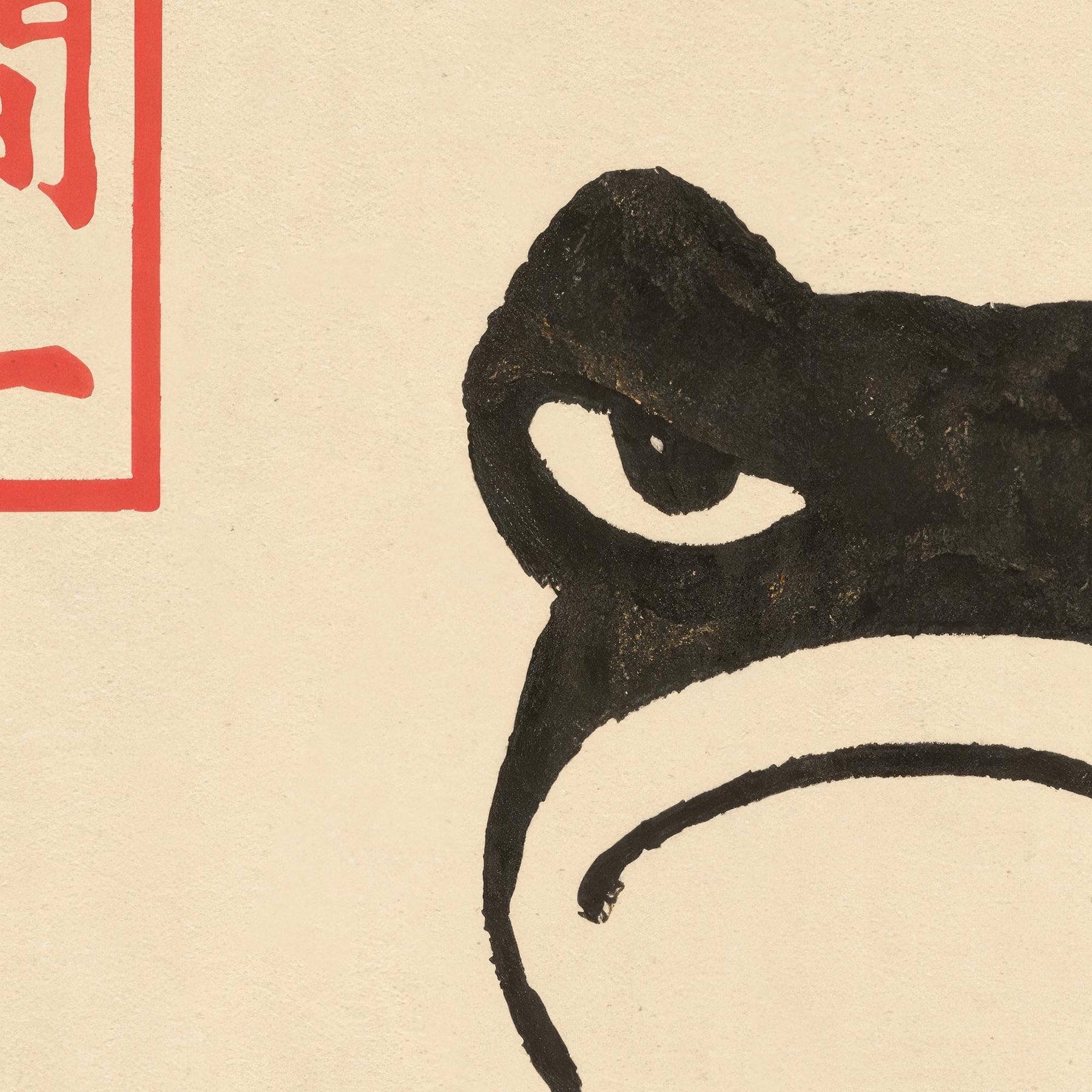 Color and design are part of the work’s appeal. The dominant tone is a warm parchment beige, set against deep ink-black linework that crisply defines the frog’s posture and the sweep of the whisk. Subtle variations of soft brown give the paper a tactile, time-warmed presence, while a single pop of vermilion—the stamp-like seal—adds a jewel-like contrast. The harmony of minimal color, expressive line, and generous negative space makes this an elegant conversation piece, especially for tea lovers and admirers of Japanese aesthetics.