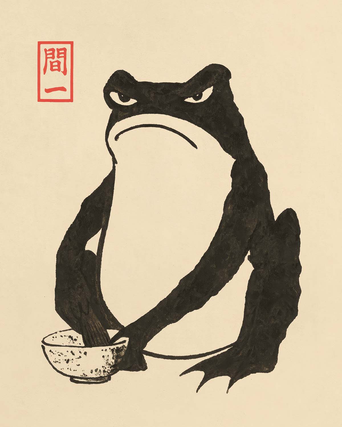 The subject of a frog whisking tea is a tongue-in-cheek nod to Japan’s tea culture—specifically the ritual of whisking powdered green tea with a bamboo chasen in a chawan. Edo audiences adored humorous prints that anthropomorphized animals, a lineage that reaches back to earlier Japanese art and carries through the ukiyo-e tradition. Here, the frog’s “angry” concentration is a charming exaggeration of the care and vigor that good tea preparation demands.