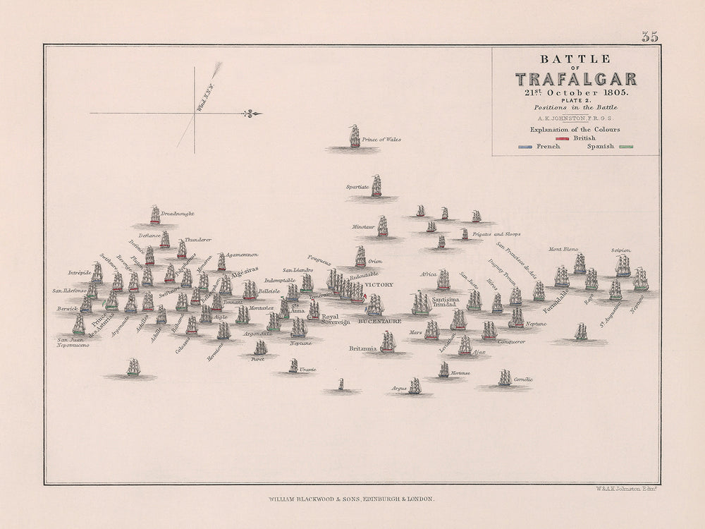 "Battle of Trafalgar: Positions in the Battle" is an exquisitely detailed antique colour lithograph by A.K. Johnston, first published in 1852 by William Blackwood and Sons. It captures the momentous Battle of Trafalgar on 21 October 1805, a pivotal naval engagement during the Napoleonic Wars. The artwork meticulously maps the positions of the British, French, and Spanish fleets using distinct colours for clarity.