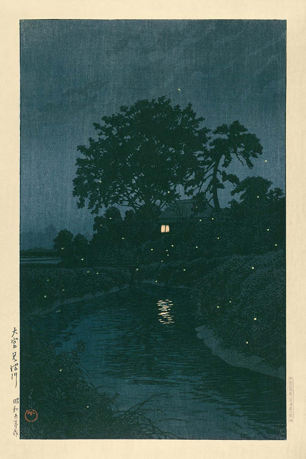 Dark River with Fireflies (Minuma River, Ômiya) by Hasui Kawase, 1935