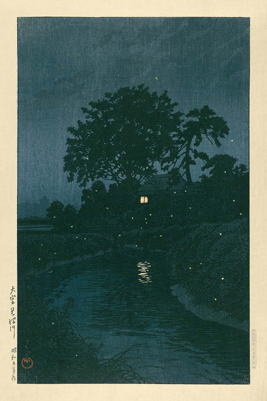 Dark River with Fireflies (Minuma River, Ômiya) by Hasui Kawase is a mesmerizing woodblock print created in 1935, showcasing the artist's masterful ingenuity. Hasui Kawase, a prominent figure in the Shin-Hanga (New Print) movement, is celebrated for capturing the serenity and tranquility of Japan’s landscapes. His works are known for blending traditional artistic techniques with modern sensibilities, creating timeless pieces that resonate with both classic and contemporary art lovers.