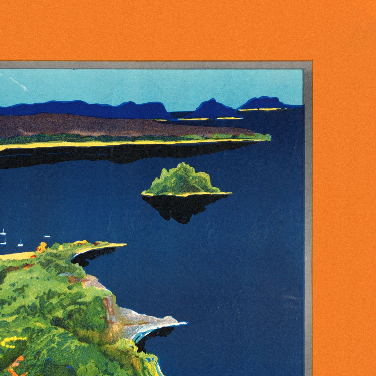 The poster’s color harmony is especially compelling: blue‑green tones suggest clear reef shallows; deep greens pick out foliage shapes; and a radiant, beach‑glow orange—visible in the sky and the bold titling—sets the entire scene aglow. The simplified silhouettes and confident typography feel authentically period, while the layered gradients evoke the softness of vintage lithography. It’s a striking focal point for coastal interiors, mid‑century spaces, or any room that craves a splash of tropical color and nostalgia.
