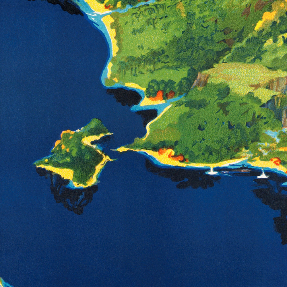 Peter Smith Templeton was an Australian commercial artist active during the mid‑20th century, part of a generation that helped define the visual language of Antipodean travel—bold color fields, simplified forms, and optimistic, sunlit compositions. Working in an era when tourism boards and railways commissioned eye-catching lithographs, Templeton’s posters balanced graphic clarity with a painterly sense of place, making the faraway feel tantalizingly close.