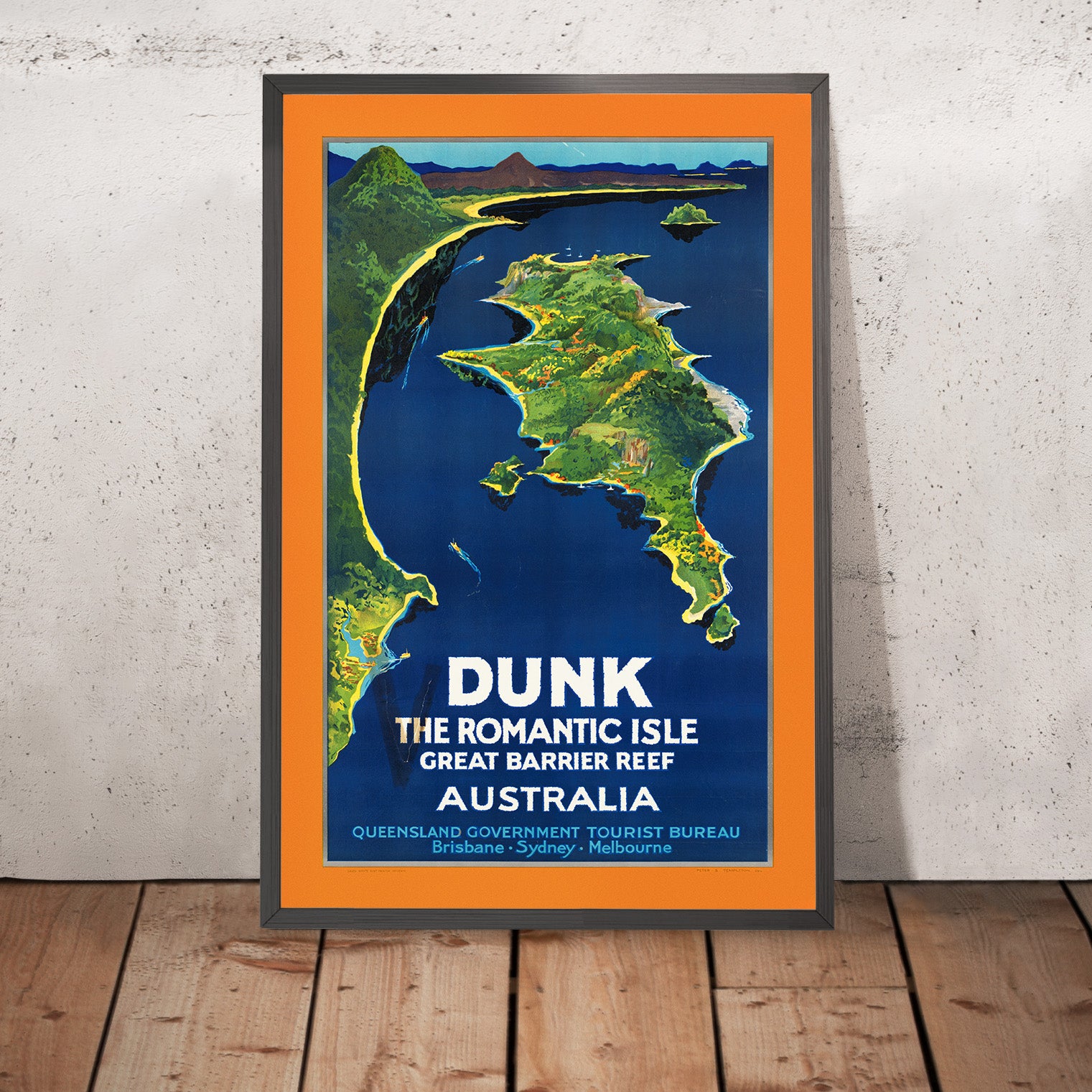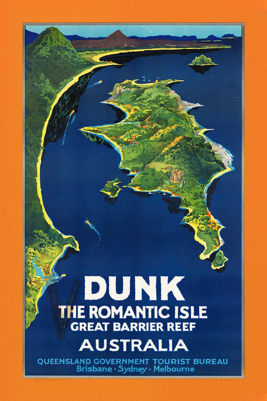 “Dunk the romantic isle. Great Barrier Reef Australia” by Peter Smith Templeton is a luminous vintage Australian travel poster that invites you to the reef-fringed shores of Dunk Island in Queensland. Created to entice holidaymakers to a tropical idyll, the design distills the island’s allure into a single sun‑soaked scene: a sweep of apricot sky at the top, tranquil reef waters below, and stylized tropical greenery framing the view. The hand-rendered title captures the language of the era—promising romance, relaxation, and a world apart on Australia’s most celebrated coral coast.