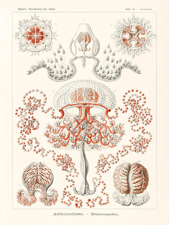 "Anthomedusae Blumenquallen (Tafel 46)" by Ernst Haeckel, first published in 1904, is an exquisite example of natural history art from the early 20th century. This illustration forms part of Haeckel's seminal work "Kunstformen der Natur" (Art Forms in Nature), which showcases the beauty and diversity of biological forms. This particular plate depicts delicate and intricate illustrations of jellyfish in various poses and forms.