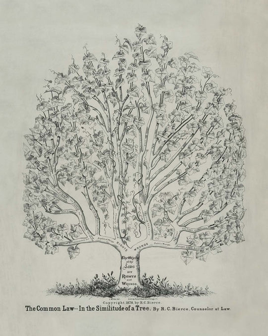 The artwork, titled "The Common Law in the Similitude of a Tree" by RC Bierce, is an intriguing vintage poster first published in 1878. It provides a captivating visual representation of the legal system, depicting the branches of law with "Rights" and "Wrongs" and their further ramifications, akin to a tree with smaller branches and leaves. RC Bierce's work offers a fascinating look into the conceptualization of law during this period, capturing the complexity and structure of the legal world.
