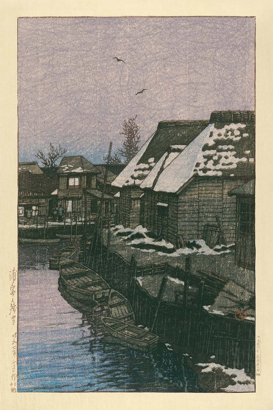 Hasui Kawase is celebrated for his ability to capture the essence of landscapes with precision and emotion. "Lingering Snow in Urayasu" stands out not only for its exquisite representation of a snowy scene but also for its thoughtful composition and the sense of peaceful isolation it evokes. This print highlights Kawase's delicate brushwork, contributing to the overall atmospheric and contemplative mood.
