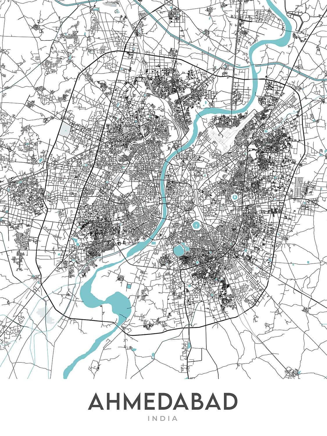 As an original creation from The Unique Maps Co., this map stands out for its unique cartography and modern aesthetics. The design is both functional and artistic, featuring clean lines and a sophisticated palette that complements any interior setting. The absence of labels adds a touch of mystery and intrigue, encouraging viewers to engage with the map and discover the city’s layout through their own perspective. This piece is not just a map, but a work of art that brings the dynamic spirit of Ahmedabad into your home, making it a perfect addition to any modern decor.