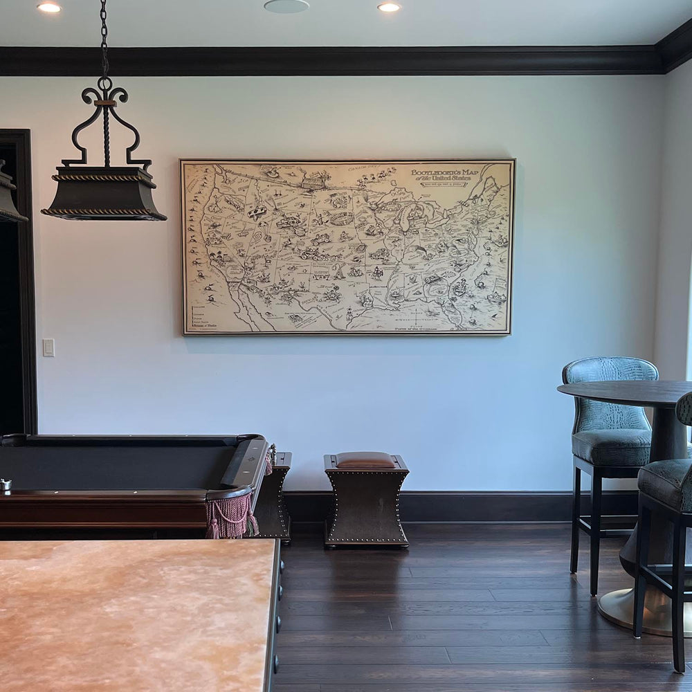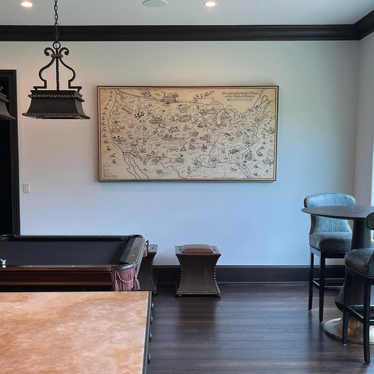 Most maps, art and illustrations are also available as a framed canvas. We use matte (not shiny) cotton canvas, stretch it over a sustainably sourced box wood frame, and then 'float' the piece within a wood frame. The end result is quite beautiful, and there's no glazing to get in the way.