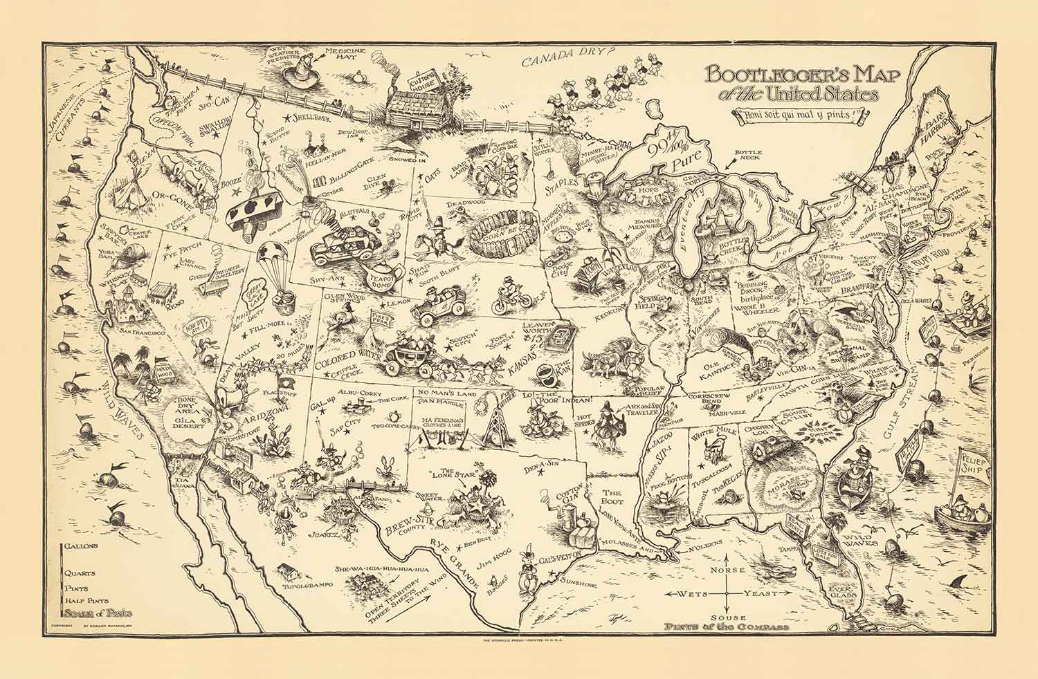 Old Alcohol Bootlegger's Map of the United States, 1926 by McCandlish: Prohibition-Era Comic Map of the US