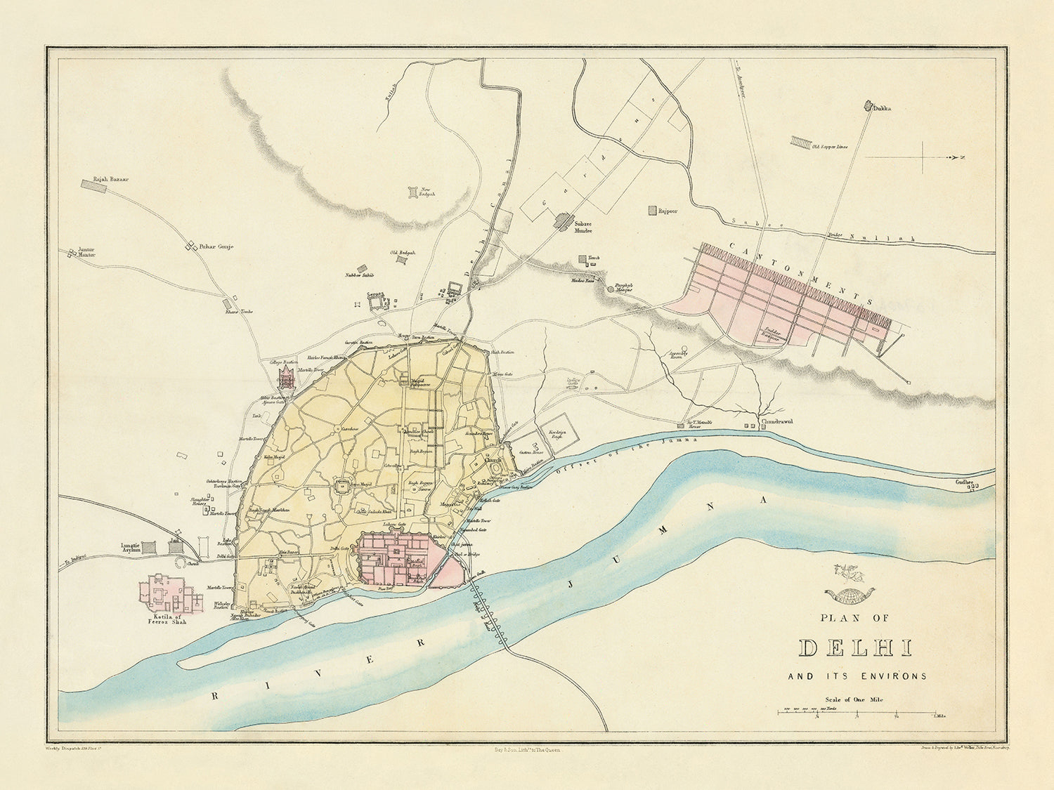 Old Map of Delhi by Weller, 1860: Jama Musjid, The Palace, Bridge of Boats, Cantonments, River Jumna