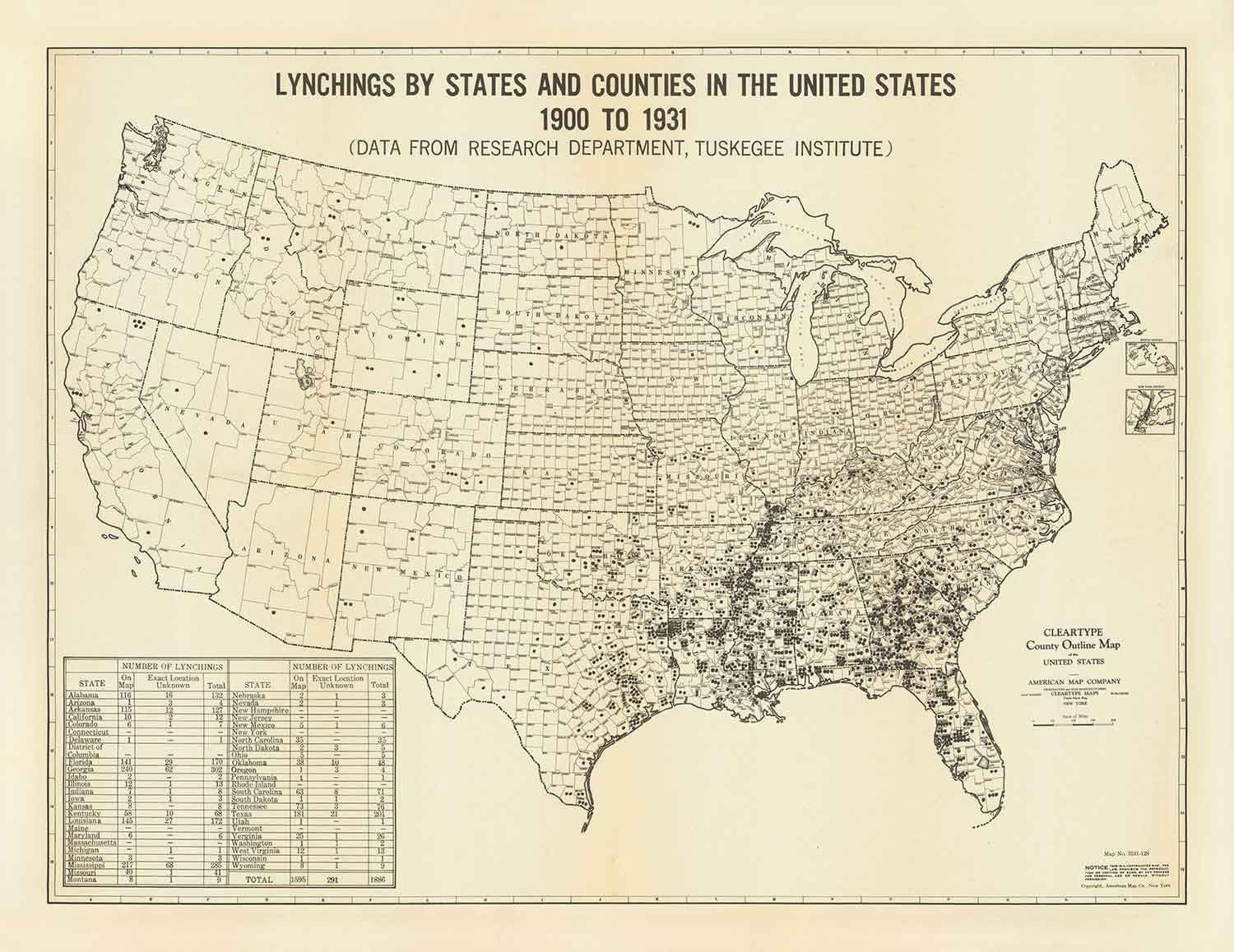 Old Map of Lynchings in America, 1900-1931: African American Racial Injustice, Deep South USA, Jim Crow, KKK