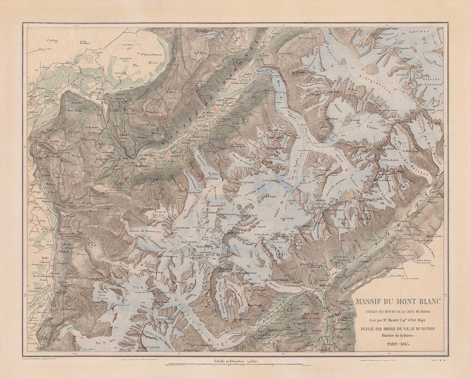 This old map depicts the Mont Blanc Massif, a mountain range located in the French Alps. The map was created in 1865 by Jean-Joseph Mieulet, a French cartographer. The map shows the various peaks, valleys, and glaciers of the Mont Blanc Massif, including Mont Blanc, the highest mountain in Europe.
