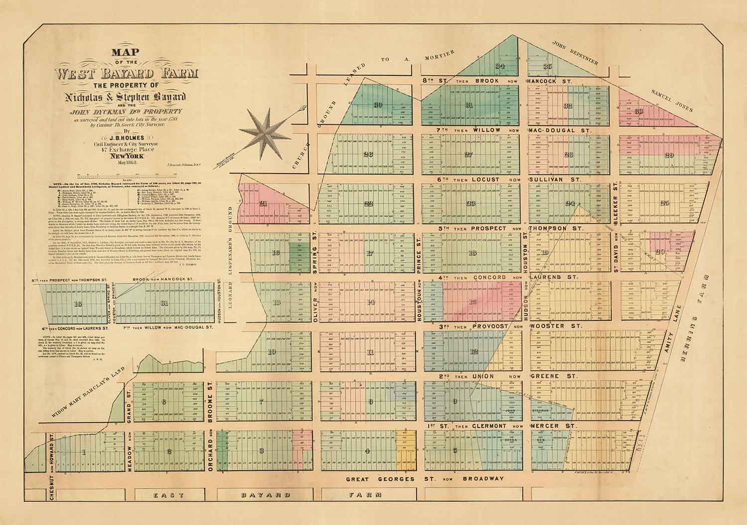 Old Map of SoHo, NYC, 1868 by John Bute Holmes: Manhattan Farmland Survey, Broadway, Bleeker, Houston St