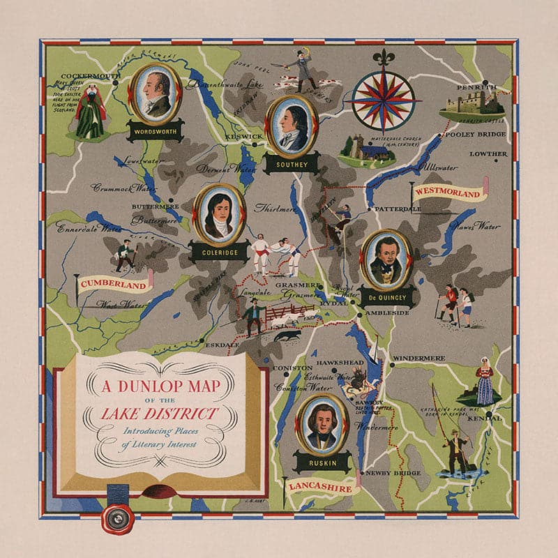 Somewhat unusually, this map is dotted with silhouettes and portraits of famous people and authors - such as Wordsworth and Ruskin, and a marker of where Mary Queen of Scots 'took shelter on her flight from Scotland'.