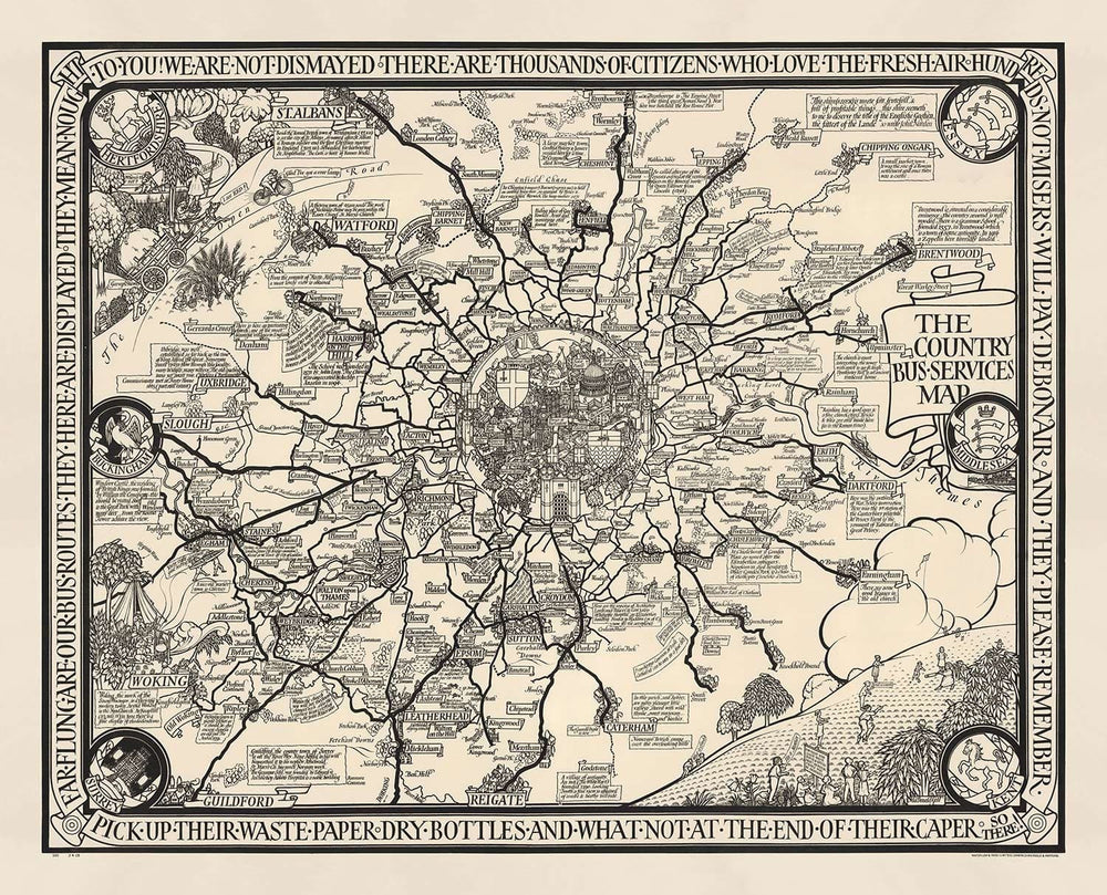 Old Monochrome Map of London, Suburbs & Commuter Belt by Max Gill in 1928: "Far flung are our bus routes"