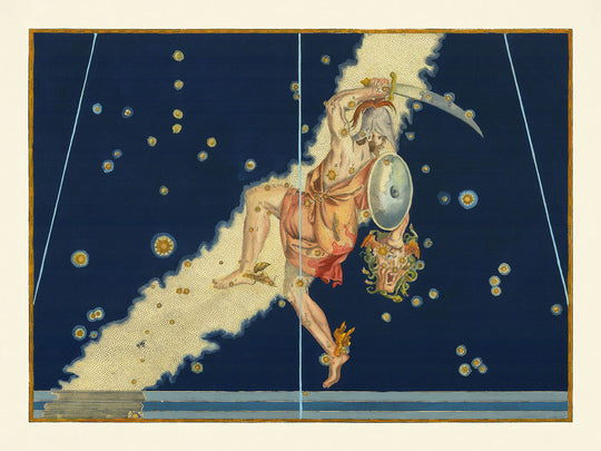 Perseus, first published in 1603, is a striking hand-coloured star chart from Johann Bayer's renowned celestial atlas "Uranometria." This detailed piece showcases the constellation Perseus in the northern sky, richly illustrating the Greek hero holding the head of Medusa, the Gorgon. A marvel of early 17th-century astronomical cartography, this star chart captures both scientific precision and artistic elegance.