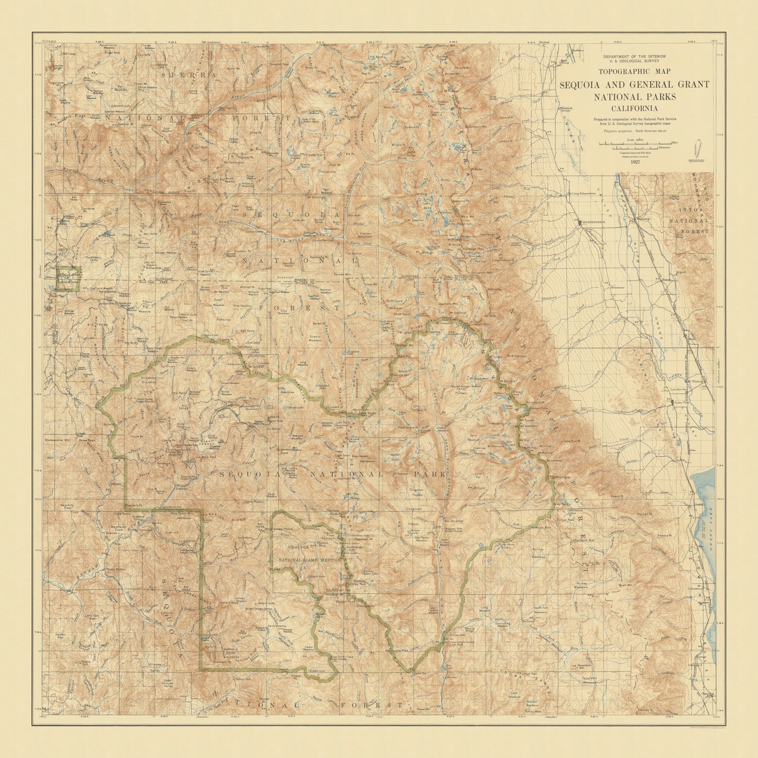 Issued in 1927 by the U.S. Geological Survey in cooperation with the National Park Service, this topographic portrait of Sequoia and General Grant National Parks captures the Sierra Nevada at a pivotal moment for American conservation. Rendered in a polyconic projection and articulated by 100‑foot contour intervals, the map translates granite massifs, plunging canyons, and high meadows into an exacting language of lines and elevations. The Great Western Divide steps across the sheet as a serrated backbone, separating watershed from watershed, while Mount Whitney anchors the alpine skyline as the highest summit in the contiguous United States. Rivers like the Kern, Kings, and Kaweah unwind through deep-cut valleys, their courses guiding both ecosystems and the earliest waves of backcountry travel.