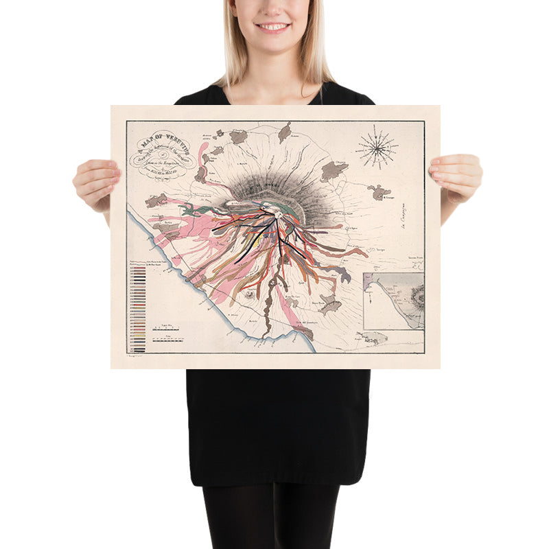 Map of Vesuvius showing the direction of the streams of Lava in the Eruptions from 1631 AD to 1831 A.D. is a rare marriage of scientific precision and lyrical design. John Auldjo orchestrates two centuries of fiery history into a legible symphony of color, each ribboned flow keyed to its year and coursing down the flanks of Vesuvius. An elegant, ornate cartouche frames the title, while a crisp legend clarifies the chronology and behavior of eruptions across the seventeenth to early nineteenth centuries. The map reads like a field notebook made beautiful: annotated paths, carefully distinguished periods, and an inset situating the volcano within the broader Bay of Naples. In Auldjo’s hands, the mountain’s episodic violence becomes a coherent visual narrative—one that invites both contemplation and close study.