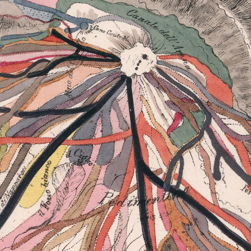 As historical document, it distills the living memory of catastrophe into cartography. The great convulsion of 1631—so devastating to the communities on Vesuvius’s slopes—anchors the sequence, after which the mountain repeatedly reasserts itself with eighteenth- and early nineteenth-century episodes that reshape valleys, fields, and routes to the sea. In a period when Naples was a magnet for Grand Tour travelers and a center of Bourbon-era science, Vesuvius became both spectacle and study. Auldjo captures that duality: the sublime theater of eruption and the sober accounting of where the molten tongues actually ran. His map charts consequences as much as flows, threading between geology and human geography to show how landscape and settlement continually negotiate the volcano’s will.