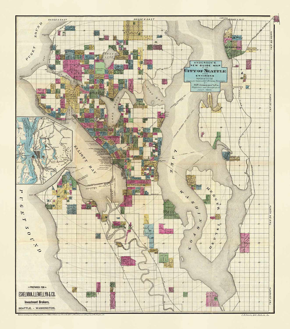 Rare Old Map of Seattle, Washington, 1890 by OP Anderson: Downtown, Lakes, Puget, Bay, Mercer, Trainlines