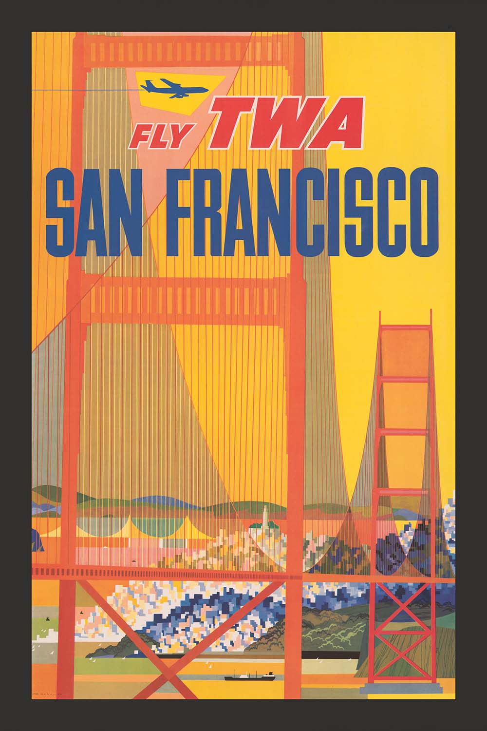 Fly TWA – San Francisco by David Klein (1957) captures the optimism and glamour of the Jet Age through an unforgettable portrait of the city by the bay. In this iconic mid-century design, a monumental orange span of the Golden Gate Bridge rises against a radiant yellow sky, while jewel-like bursts and confetti-like dots drift over a deep blue bay—an abstracted celebration of light, motion, and the promise of travel. Klein’s composition distills San Francisco into bold color fields and crisp silhouettes, evoking hills, water, and skyline with effortless modernity.