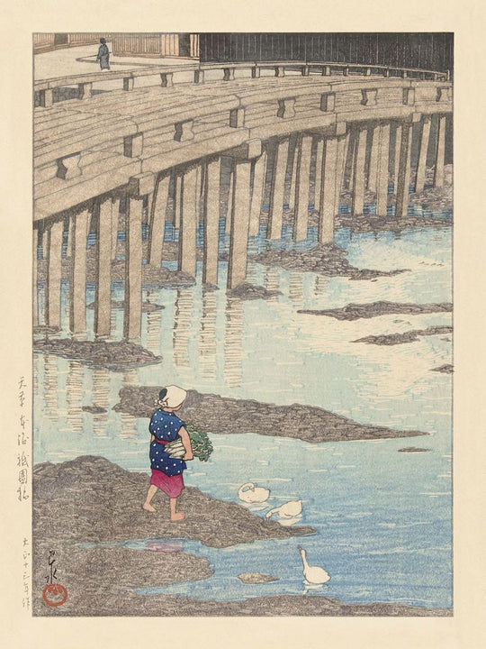 The Gion Bridge in Hondo in Amakusa by Hasui Kawase is an iconic woodblock print created in 1924. born as part of the Shin-Hanga movement, which aimed to rejuvenate the traditional Japanese woodblock print with elements of Western art. Kawase is renowned for his stylized landscapes that capture the ethereal beauty of the changing seasons and regional scenery, drawing from both Japanese and Western artistic traditions.