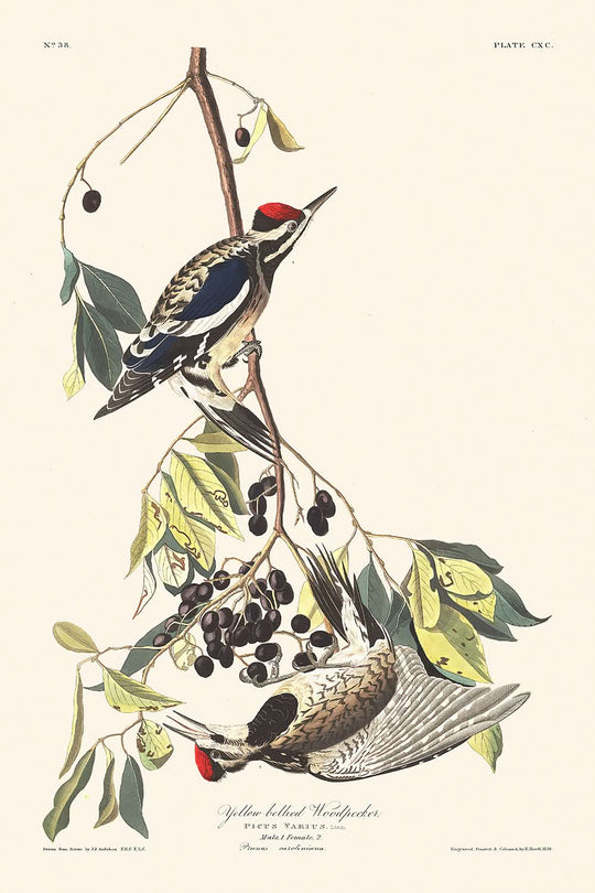 Yellow-bellied Woodpecker, first published in 1827, is one of the captivating bird illustrations from John James Audubon's acclaimed series, The Birds of America. This exquisite print captures the vibrant plumage and natural behavior of the Yellow-bellied Woodpecker, including its unique red forehead and crown, which starkly contrast against the lush surroundings depicted in the piece.