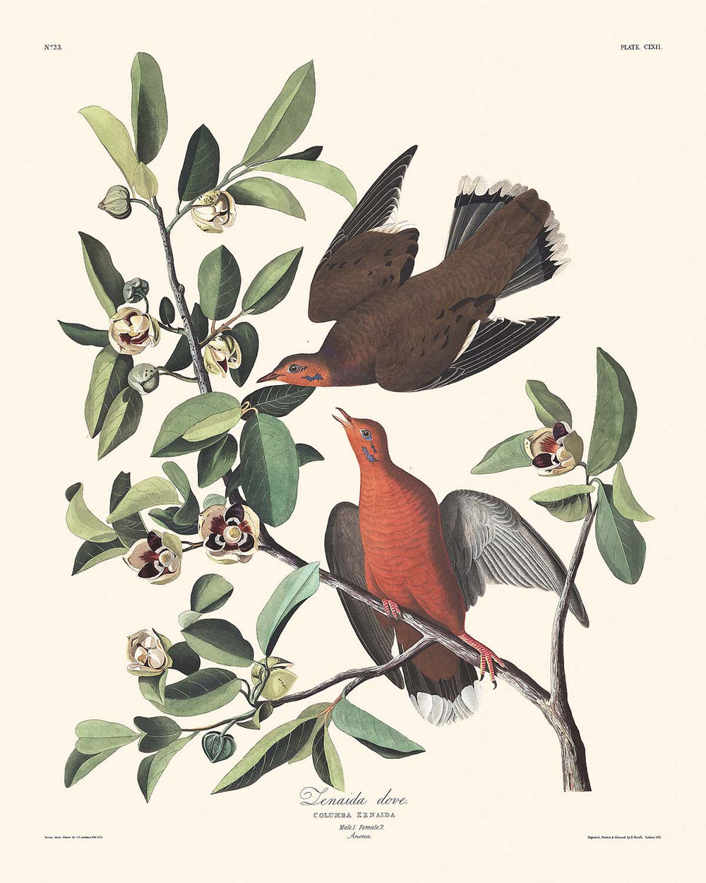 The "Zenaida Dove" image is notable not only for its artistic finesse but also for its narrative richness. Audubon eloquently describes the dove's evocative cooing, capable of stirring profound emotion, even converting a hardened soul like a pirate's towards redemption. Such powerful storytelling, combined with meticulous detail, makes this artwork deeply appealing for both the ornithologist and the art connoisseur.