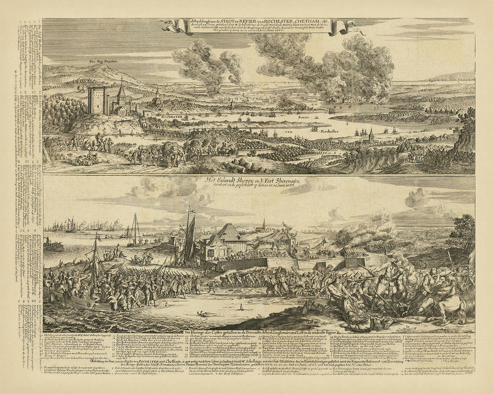 The "Battle of Chatham / Raid on the Medway," originally titled "Afbeeldingh van de stadt en revier van Rochester, Chatham . . . 1667 | Het Eylandt Shepey en 't Fort Shirenasse verovert ende geplondert op den 20 en 21 Junij 1667," is a masterful copperplate engraving created by the acclaimed artist Romeyn De Hooghe in 1669. This rare and historically significant piece vividly captures the intense naval conflict between the English and Dutch fleets during the Second Anglo-Dutch War, particularly the notorious Raid on the Medway in June 1667.