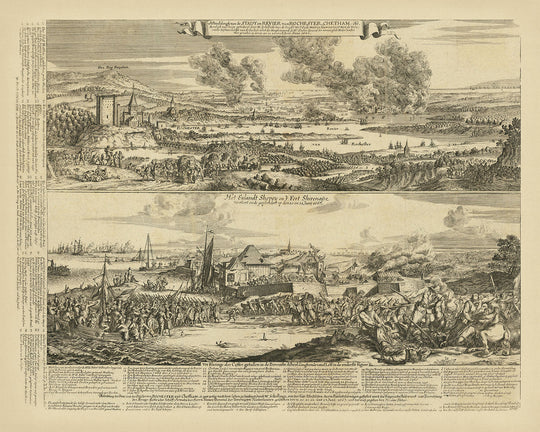 The engraving's compositional brilliance and historical fidelity make it a compelling addition to any fine art collection. The juxtaposition of the serene river landscape against the chaotic naval battle is a visual articulation of 17th-century warfare, executed with De Hooghe’s characteristic finesse and attention to detail.