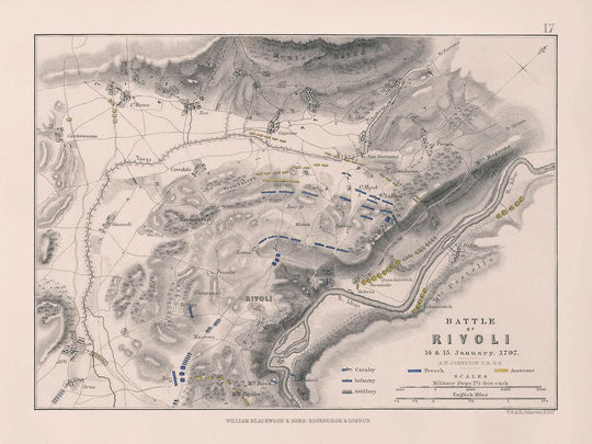Introducing the remarkable "Battle of Rivoli, 14 & 15 January 1797" by AK Johnston—a stunning antique colour lithograph that traces the intricate choreography of one of history's notable military engagements. Created in 1797, this battle plan provides a vivid depiction of the strategic positions and movements of French and Austrian forces, illustrated through an array of cavalry, infantry, and artillery units. With terrain details rendered through hachures, this artwork offers a meticulous representation of the battlefield's landscape.