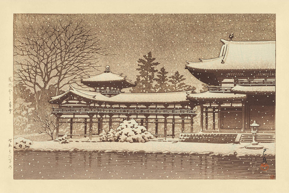 Evening Snow at Byodoin Temple (Phoenix Hall) by Hasui Kawase, 1935