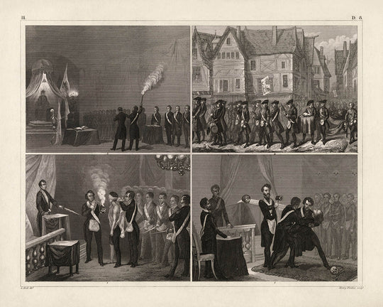 Discover the intriguing world of Freemasonry through "Plate 35. Freemasonry," an exquisite antique colour lithograph created by Johann Georg Heck in 1849. Drawn from Heck’s celebrated "Bilder-Atlas zum Conversations-Lexicon," this remarkable print offers a captivating visual exploration of the symbols, regalia, and rituals associated with the mysterious and influential society of Freemasons. Rich in historical significance and aesthetic charm, this artwork provides a unique window into the cultural practices and symbolism of the mid-19th century.