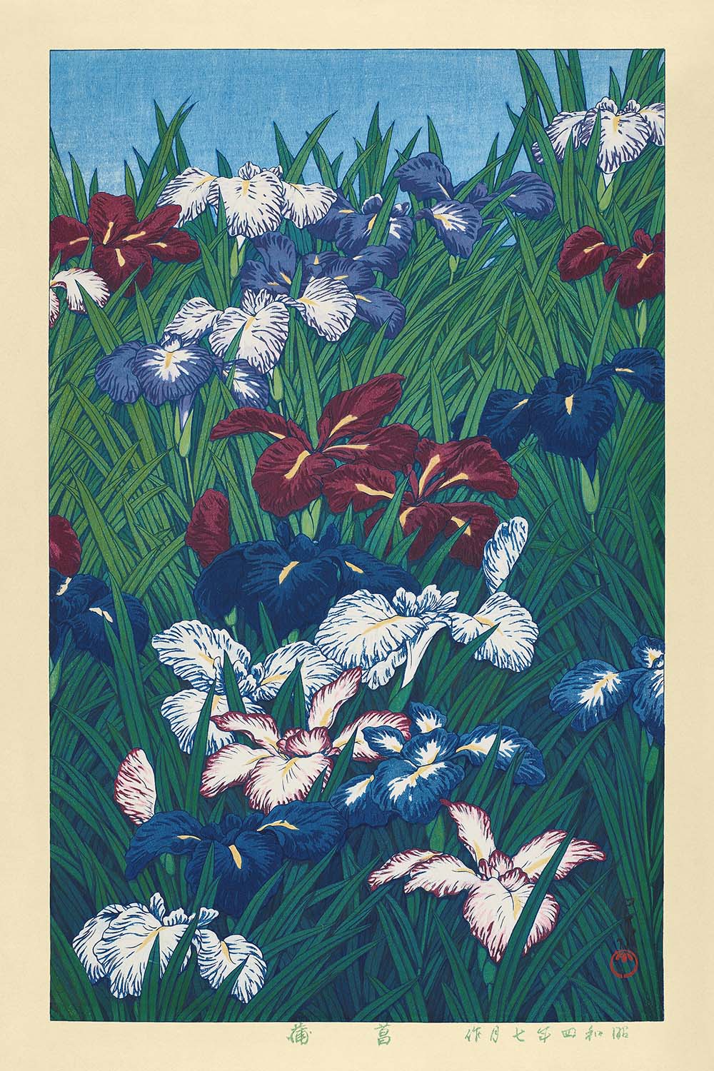 Discover the enchanting beauty of Irises by the esteemed Japanese artist Hasui Kawase, crafted in 1935. Renowned for his mastery in Japanese woodblock prints, Kawase was integral to the Shin-hanga movement, which revitalized traditional Japanese printmaking techniques through a modern lens. His works are celebrated for their serene portrayal of landscapes and seasonal transitions, often encapsulating a moment of profound tranquility and natural harmony.