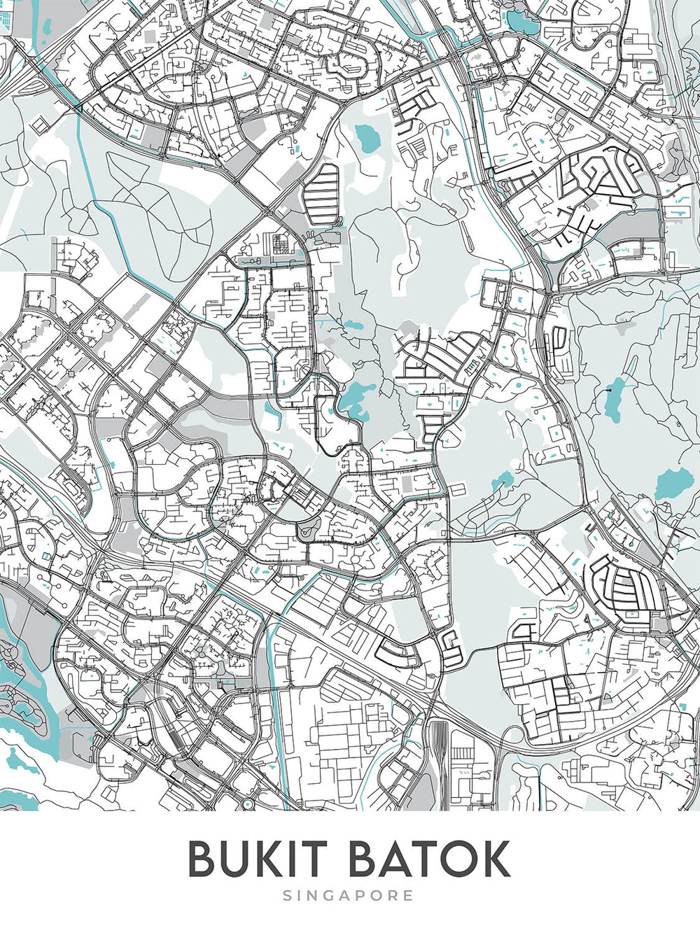 Bukit Batok, a serene and vibrant neighborhood in Singapore, is the focal point of this meticulously crafted map by The Unique Maps Co. This modern neighborhood map, devoid of labels, invites the viewer to explore Bukit Batok through a lens of elegant simplicity and contemporary design. The map covers a region teeming with both lush green spaces and bustling urban areas, offering a harmonious blend of nature and city life. The absence of labels enhances the visual impact, encouraging an appreciation of the area's geography and layout through pure visual elements. This design choice not only makes the map a captivating piece of art but also a conversation starter, ideal for those with an affinity for urban aesthetics and modern cartography.