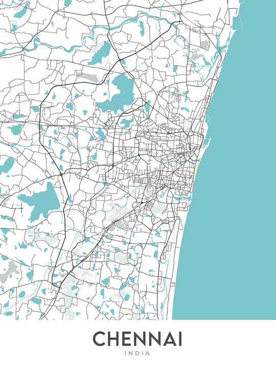 Immerse yourself in the bustling metropolis of Chennai with this stunning map by The Unique Maps Co. This modern, meticulously detailed street map offers a fresh perspective on one of India's most vibrant cities. With its clean lines and absence of labels, the map invites you to explore the intricate network of streets that lace through Chennai’s diverse neighborhoods. From the cultural hub of Mylapore to the commercial dynamism of T. Nagar, and from the serene beachside of Besant Nagar to the upscale enclaves of Anna Nagar, this map captures the essence of Chennai's varied urban landscape.
