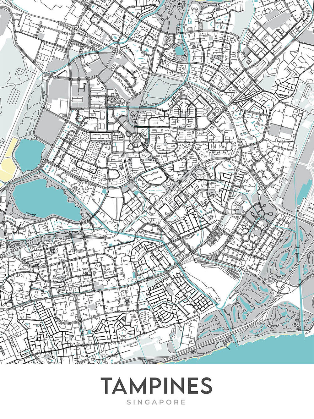 Immerse yourself in the intricate details of Tampines, a vibrant neighborhood located in the bustling city-state of Singapore, through this exquisitely crafted map. This modern neighborhood map, titled "Tampines," captures the essence of urban living combined with green spaces, reflecting the dynamic blend of nature and urbanity that characterizes the area. This map focuses on a detailed street layout, offering a glimpse into the area’s layout without the clutter of street names, allowing the viewer to appreciate the clean lines and modern design aesthetic. The neighborhood of Tampines is known for its cohesive community feel, bustling shopping malls, and extensive parklands, making this map not only a visual delight but also a representation of a well-balanced urban lifestyle.