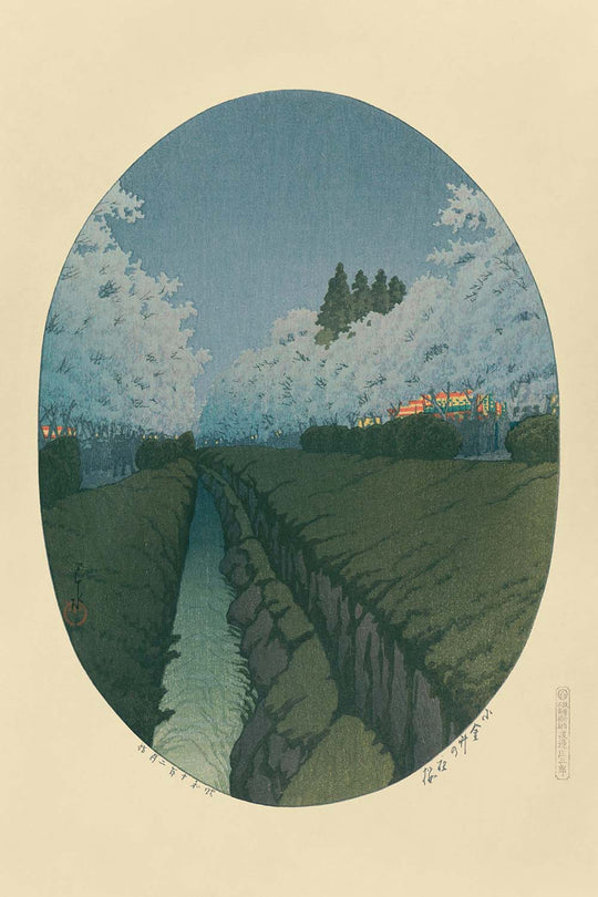 Night View of Cherry Blossoms at Koganei by Hasui Kawase comes to life in this exquisite woodblock print created in 1935. An esteemed artist from the Shin-Hanga movement, Hasui Kawase is celebrated for his serene and contemplative landscapes that blend traditional Japanese style with subtle Western influences. This particular piece captures the ephemeral beauty of cherry blossoms at night, a subject often revered in Japanese culture for its symbol of beauty and transience.