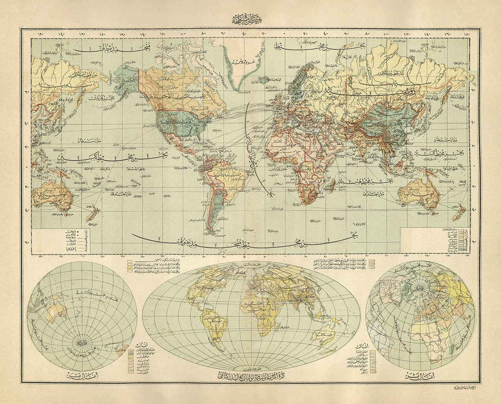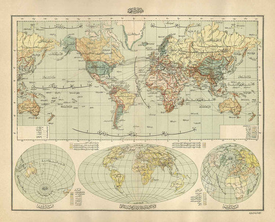 Old Arabic Map of the World by Hafiz Ali Esref in 1893: America, Great Britain, Australia, Arabia, Morroco