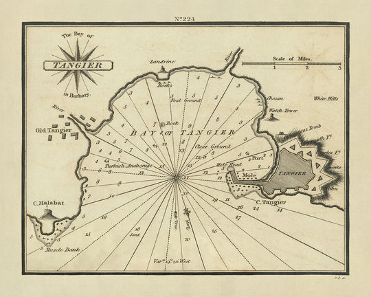 This finely crafted chart offers more than just a geographical representation; it serves as a vital navigational tool with its detailed soundings and anchorages clearly marked. The inclusion of these elements not only guided mariners safely into the bay but also reflected the evolving needs of naval and merchant shipping during the early 19th century. The map meticulously documents various landmarks of Tangier, from the bustling port and the historic Mole Head to the strategic Turkish Anchorage and the surrounding hills, providing a comprehensive view of the area's maritime landscape.