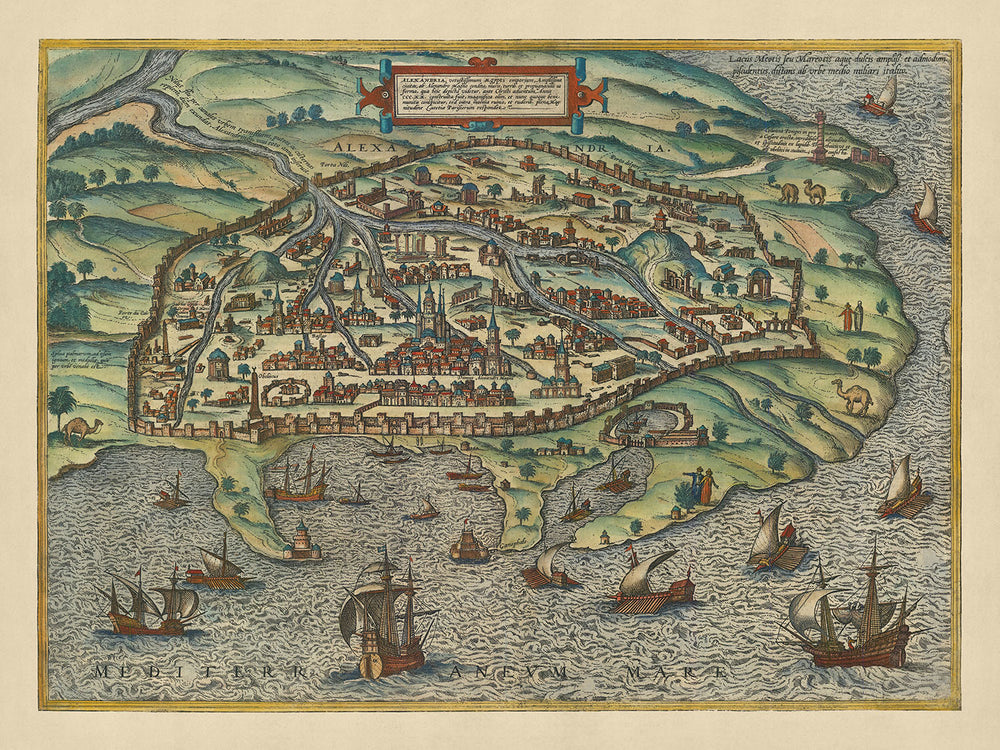 As you explore the map, you will notice the meticulously drawn waterways that flow through the city, reflecting Alexandria's vital connection to the Mediterranean Sea. The presence of ships in the harbor further emphasizes the city's role as a major trading hub in the ancient world. The surrounding illustrations of camels and other figures offer a glimpse into the daily life and vibrant culture of the city's inhabitants.