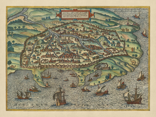 Old Birdseye Map of Alexandria, Egypt by Braun, 1575: Pompey's Pillar, Towers, Battlements, Ships, Waterways