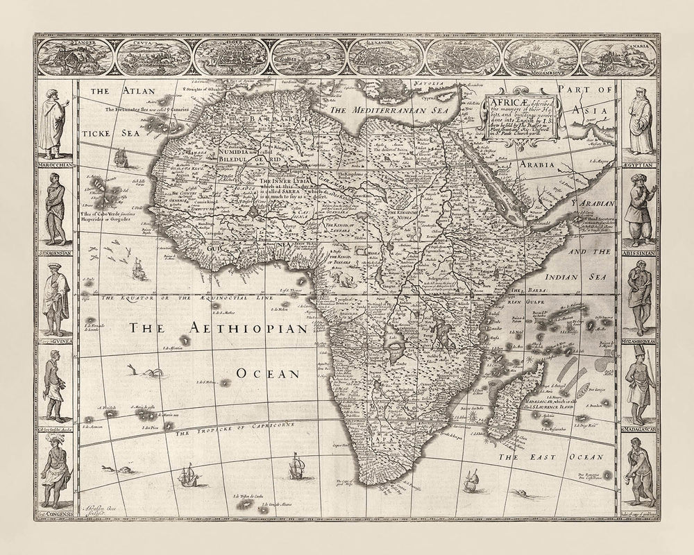 The map is a testament to the themes and topics that fascinated early modern Europe, illustrating the political and physical landscapes of Africa with remarkable precision. It captures the vastness of the continent, from the Mediterranean Sea in the north to the mysterious realms of the "Aethiopian Ocean" in the south. The map also hints at the rich cultural tapestry of Africa, with depictions of local attire and scenes of daily life along its margins, offering a glimpse into the diverse societies that thrived across the continent.