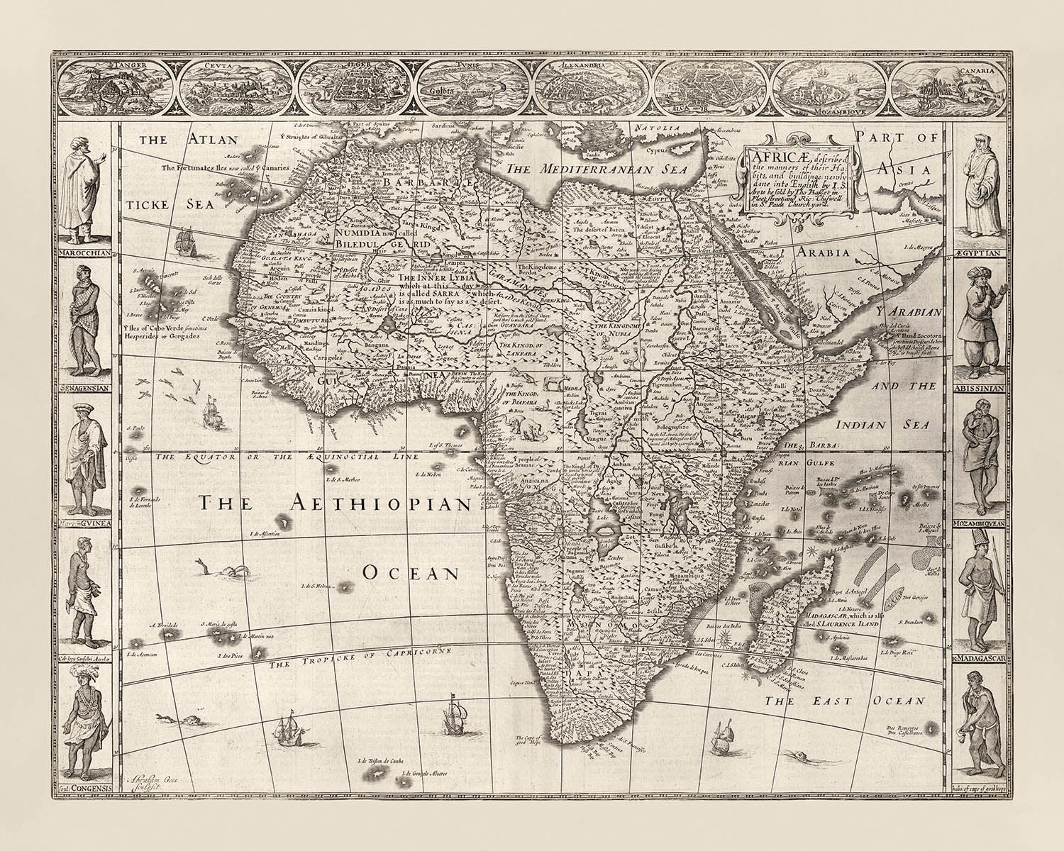 Old Monochrome Map of Africa by Speed, 1676: Showing Traditional People & Attire