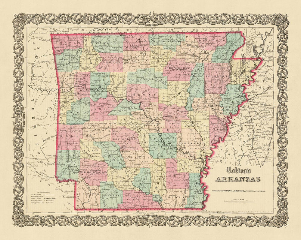 This map is a testament to the unrivaled skill and precision of J.H. Colton, widely regarded as the finest American mapmaker of his time. His maps are renowned for their accuracy and attention to detail, and this piece is no exception. It showcases the region of Arkansas as it was in 1855, complete with the borders and place names of the time. As you explore this map, you will find that many of these names and borders have changed over the past 150 years, reflecting the dynamic nature of American history.