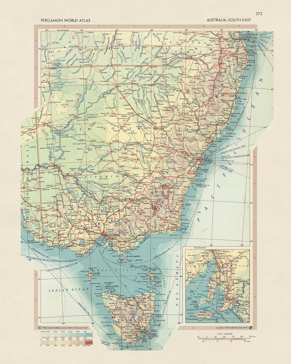 Old Map of Southeast Australia, 1967: Melbourne, Sydney, Brisbane, Adelaide, Perth