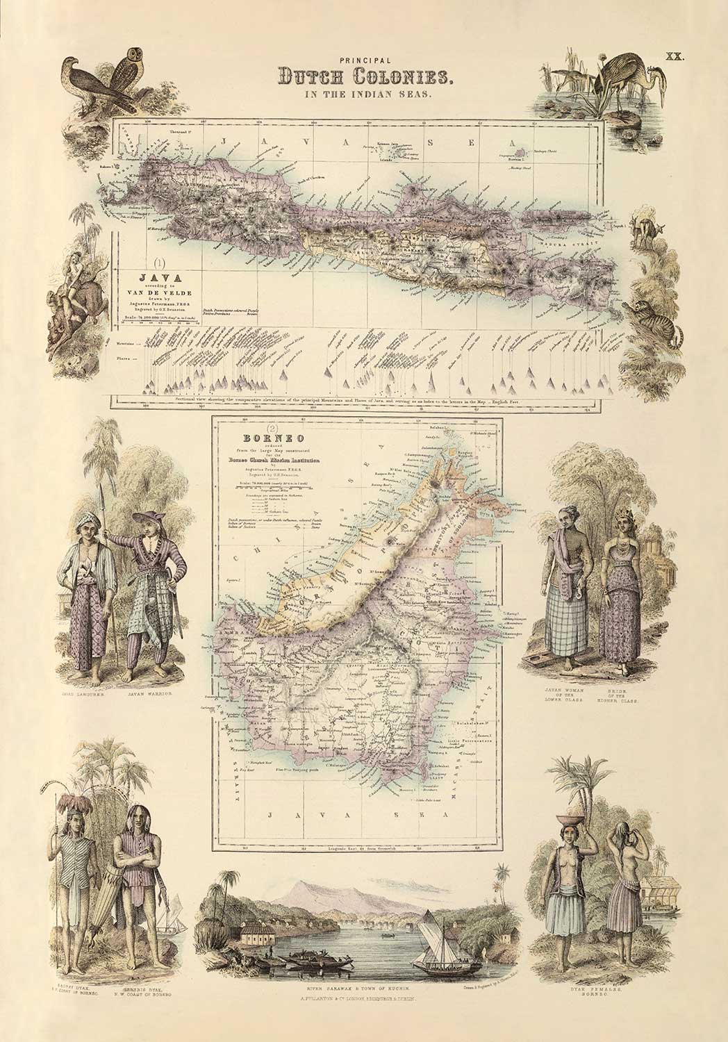 This Victorian masterpiece map of the Dutch East Indies, with its rich original handcolouring, was first published in 1872 by A. Fullarton & Co. in its seminal Royal Illustrated Atlas. The map was engraved by G.H Swanston and is notable for being the last great highly decorative world atlas.